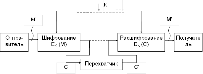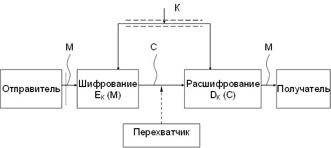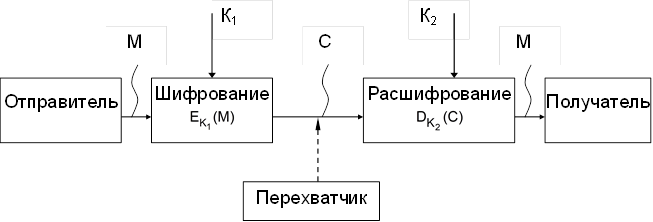 Отправитель генерирует открытый текст исходного сообщения М, которое должно быть передано законному получателю по незащищенному каналу. За каналом следит перехватчик с целью перехватить и раскрыть передаваемое сообщение. Для того чтобы перехватчик не смог узнать содержание сообщения М, отправитель шифрует его с помощью обратимого преобразования ЕК и получает шифртекст (или криптограмму) С = ЕК (М), который отправляет получателю.