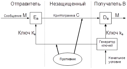 Обобщенная схема асимметричной криптосистемы с открытым ключом показана на рис. 4.1. В этой криптосистеме применяют два различных ключа: Кв – открытый ключ отправителя А; kв – секретный ключ получателя В. Генератор ключей целесообразно располагать на стороне получателя В (чтобы не пересылать секретный ключ kв по незащищенному каналу). Значения ключей Кв и kв зависят от начального состояния генератора ключей.