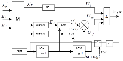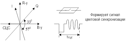 Для того, чтобы осуществить восстановление поднесущей с такой точностью вместе с сигналом TV-центра передается сигнал цветовой синхронизации(вспышка). Принцип разделения основан на умножении сигнала цветности на сигналы опорных генераторов.