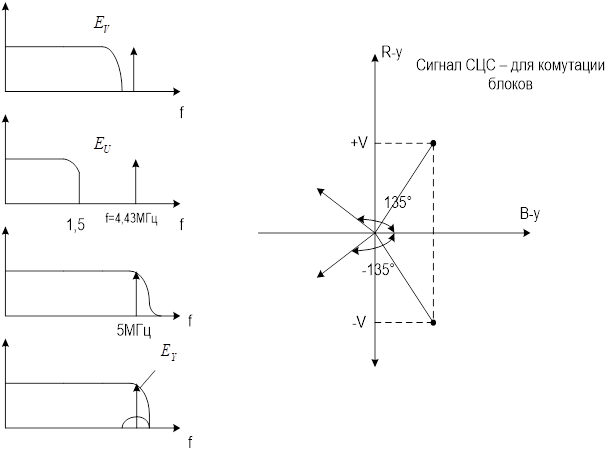 Такой прием позволяет устранить дифференциально-фазовые искажения. При этом на выходе 2-го сумматора формируется сигнал цветности, амплитуда вектора которого несет информацию о насыщенности цветом, а фаза несет информацию о цветовом тоне. Этот метод передачи двух сигналов по одной поднесущей получил название квадратурной модуляции. А сигнал цветности можно рассматривать как одну поднесущую с амплитудно-фазовой модуляцией. Формирование сигнала СЦС, формируются на задних площадках СГИ импульсы цветовой синхронизации (импульсы вспышки) примерно 10 периодов вспышки, причем фаза поднесущей сдвинута относительно синей цветовой оси В-у от строки к строке на угол ±135º. Изменение фазы поднесущей является информацией о знаке составленного сигнала цветности.