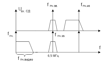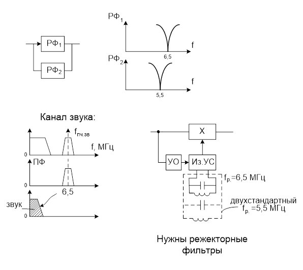 РФ предназначен для подавления сигнала звука в канале изображения, если это одностандартный канал звука, то fреж.=6,5 МГц; если двухстандартный канал - fреж.=5,5 МГц.