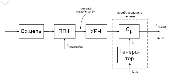 Настройка селектора осуществляется с помощью изменения избирательных цепей за счет изменения емкости варикапов: КВ121. Радиоканал ТВ строится по супергетеродинной схеме, т.е. с преобразованием частоты вещательного канала в область промежуточной частоты. При этом частота гетеродина выбирается выше, чем частота вещательного телевидения на 38МГц.