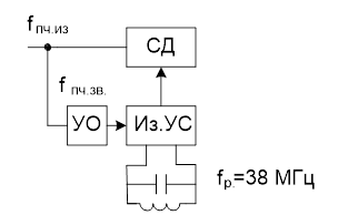В СД, выполненном, как правило, по принципу балансного перемножения, на выходе происходит еще одно преобразование частоты группового сигнала с вычитанием частоты fпч. изобр.=38 МГц.