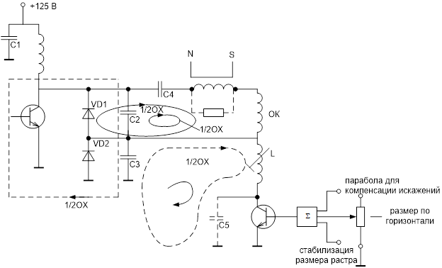 В первую половину прямого хода энергия накопленная в строчных катушках создаёт линейно уменьшающийся ток отклонения при этом С4 подзаряжается к моменту прихода лучей в середине экрана, когда ток равен нулю открывается транзистор строчный и к этому моменту вся энергия накоплена в С4 .Вторая половина прямого хода С4 разряжается через открытый транзистор строчный и через диод VD2 перемещает луч по середине экрана до правой части экрана – энергия накапливается в строчных катушках. В момент закрывания транзистора на коллекторе формируется импульс обратного хода, он образуется в результате колебательного процесса в колебательном контуре, образованный индуктивностью строчных катушек и С2 . Как правило ёмкость С3 >> C2  и она не оказывает влияния на колебательный процесс, при этом требуемую длительность обеспечивает конденсатор С2 . Для формирования размера по горизонтали, а также коррекции геометрических искажений по вертикали в выходном каскаде добавляется дополнительный контур из С3 , С5 и L. Во время первой половины обратного хода С2 подзаряжается током строчных катушек и током первичной обмотки ТДКС. При этом С3 заряжается током первичной обмотки ТВС и током дополнительного контура. Ток первичной обмотки является источником энергии  поступающей в выходной каскад каждый период во время обратного хода. В тоже время С3 подзаряжается от С5 ёмкость которая выбирается на много больше ёмкости С3 , при этом амплитуда импульса напряжения на конденсаторе С3 пропорциональна величине зарядного тока, большую часть которого составляет ток дополнительного контура. В середине обратного хода синусоидальный импульс достигает максимума и этот импульс является суммой напряжений на конденсаторе С2 и С3 . Во время второй половины обратного хода С2 и С3 разряжаются при этом С2 разряжаясь создаёт ток отклонения, а С3 подзаряжает конденсатор С5 , т.е. меняя ток дополнительного контура можно менять и напряжение на конденсаторе С2 , тем самым размер по горизонтали.