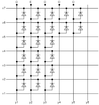 Однако при больших количествах элементов отображения поэлементный способ связан с необходимостью использования больших значений мгновенных яркостей и малых времён выборки, т.е. требует быстродействующих индикаторов и мощных ключей. При построчном способе последовательно воспроизводится выборка одной строки за другой или столбца за столбцом, причём одновременно выбираются в каждой строке или столбце все необходимые индикаторы для отображения знаков, поэтому в этом случае