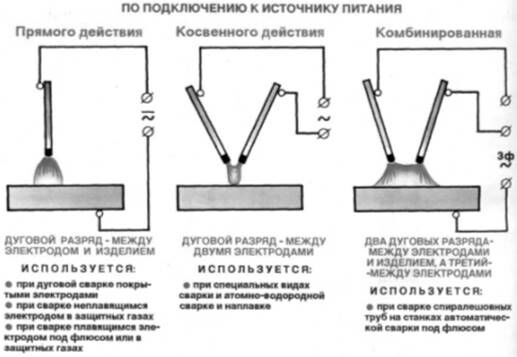 По подключению к источнику питания различают, дугу прямого действия (зависимую дугу) и дугу косвенного действия (независимую дугу). В первом случае дуга горит между электродом и основным металлом, который также является частью сварочной цепи, и для сварки используется теплота, выделяемая в столбе дуги и на электродах; во втором - дуга горит между двумя электродами. Основной металл не является частью сварочной цепи и расплавляется преимущественно за счёт теплоотдачи от газов столба дуги. В этом случае питание дуги осуществляется обычно переменным током, но она имеет незначительное применение из-за малого коэффициента полезного действия дуги (отношение полезно используемой тепловой мощности дуги к полной тепловой мощности).