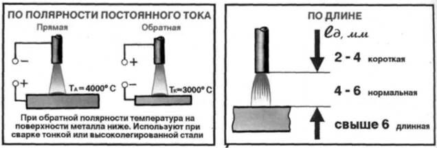 По полярности постоянного тока различают дуги, питаемые постоянным током прямой (минус на электроде) или обратной (плюс на электроде) полярности или переменным током. В зависимости от способов сварки применяют ту или иную полярность. Сварка под флюсом и в среде защитных газов обычно производится на обратной полярности.