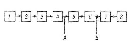 Метод половинного разделения элементов. Во многих случаях поиск неисправностей приходится осуществлять при отсутствии статистических данных о надежности элементов систем, трудоемкости и продолжительности их проверок. В этом случае рекомендуется применять метод половинного разделения элементов, или «метод средней точки». Идея этого метода состоит в том, что отказ любого элемента считают равновероятным. Начинают поиск с отыскания средней точки А (рис. 3.3), делящей систему на два блока 1-4 и 5-8. Затем проверяют один из блоков 1-4 или 5-8. Блок, в котором обнаружена неисправность (например, 5-8), в свою очередь подвергают половинному разделению на более мелкие блоки и отысканию средней точки Б. Аналогично предыдущему проверяют блоки 5-6 или 7-8. Этот процесс продолжают до обнаружения отказавшего элемента. Рассмотренный метод является наиболее выгодным, так как предусматривает минимум проверок.