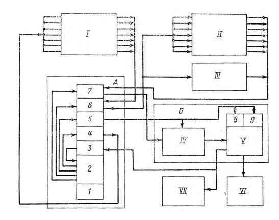 | Рис.3.4. схема системы автоматического контроля: А- программирующее устройство; Б- логическое устройство; I- генератор стимулирующих сигналов; II- объект; III- устройство самопроверки; IV- компаратор; V- анализатор; VI- записывающее устройство; VII- индикатор; 1-9 – блоки программирующего устройства и анализатора |