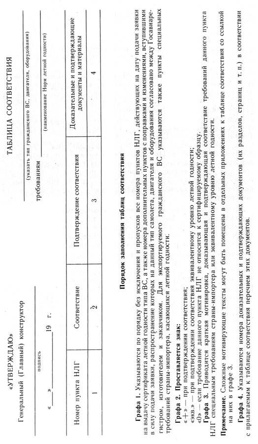 По результатам заводских, государственных и эксплуатационных испытаний исполнитель и заказчик устанавливают>»2 х соответствие самолета (вертолета), двигателей и оборудования требованиям Норм и представляют таблицу соответствия вместе с другими документами и материалами в Госавианадзор, который выдает сертификат летной годности, если по результатам представленных материалов установлено соответствие самолета (вертолета) данного типа требованиям действующих Норм.