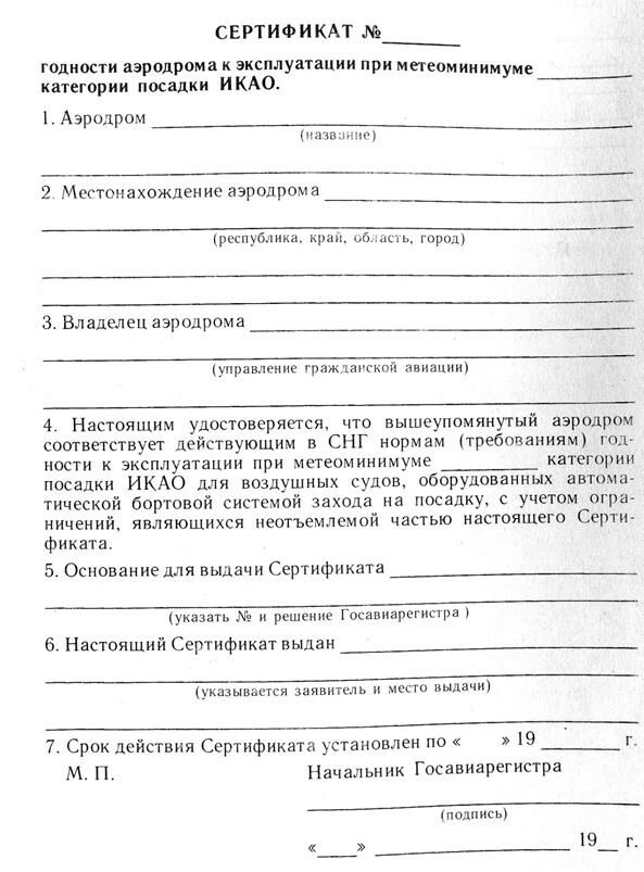Сертификация аэродромов производится в соответствии с «Правилами сертификации и контроля соответствия гражданских аэродромов нормам, определяющим их годность к эксплуатации». Этими правилами устанавливается порядок сертификации аэродромов, оборудованных для эксплуатации по минимумам I, II и III категорий ИКАО, и порядок контроля соответствия аэродромов НГЭА. Правила являются обязательными для выполнения министерствами, государственными комитетами, ведомствами, предприятиями, учреждениями и организациями, участвующими в проектировании, строительстве (реконструкции, техническом переоснащении) и эксплуатации аэродромов.