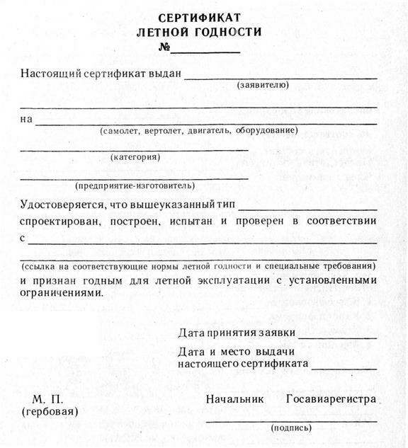 Наличие сертификата летной годности типа ВС дает право Главной инспекции ГА заносить в Государственный реестр гражданских ВС каждый экземпляр сертифицированного ВС с выдачей на него удостоверения о годности к полетам.