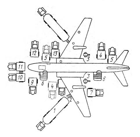 Рис. 2.1. Размещение передвижных средств механизации при обслуживании самолета: