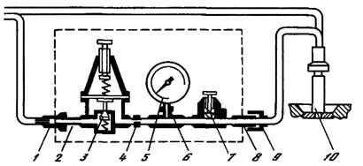 Рис. 2.8. Принципиальная схема прибора для проверки герметичности надпоршневого пространства цилиндров двигателя: 1 - быстросъемная муфта; 2 - входной штуцер; 3 - редуктор; 4 - калиброванное сопло; 5 - манометр; 6 - демпфер стрелки манометра; 7 - регулировочный винт; 8 - выходной штуцер; 9 - соединительная муфта; 10 - присоединительный штуцер