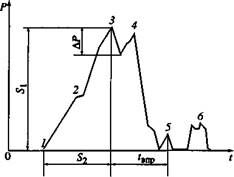 В точке 3 поднимается игла форсунки. При этом давление падает, поскольку высвободившийся объем не успевает заполниться топливом, а затем снова повышается до определенной величины. Точка 4 на большой частоте вращения коленчатого вала двигателя может характеризовать максимальное давление процесса впрыска. Однако для нормального процесса в режиме холостого хода это давление обычно фиксируется по характерному пику точки 3. В точке 5 происходит "посадка" иглы форсунки и впрыскивание заканчивается, после чего происходит "посадка" в седло нагнетательного клапана плунжера. Импульсы остаточного давления (6) появляются в результате недостаточной герметичности нагнетательного клапана. Величина сигнала S1 определяет затяжку пружины форсунки и статическое давление начала впрыска. Перепад давления DР характеризует подвижность иглы форсунки. Путем интегрирования на периоде впрыска tвпр можно оценить цикловую подачу топлива. Время задержки впрыска S2 характеризует зазор в плунжерной паре, вызывающий утечку топлива между гильзой и плунжером.