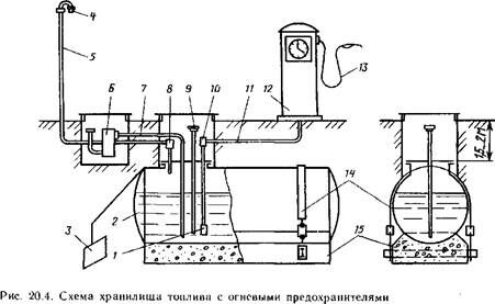 Наибольшее распространение получила система хранения топлива с огневыми предохранителями. Ее суть – резервуар сообщается с внешней средой, а воздух может попасть в него, только пройдя огневой предохранитель. Рассмотрим схему хранилища топлива с огневыми предохранителями (рис. 20.4). Резервуар 2 устанавливают в предварительно вырытом котловане на бетонные подушки 15, засыпают песком и крепят к фундаменту хомутами 14. Если грунтовые воды отсутствуют, резервуар укладывают на песчаные подушки без крепления.