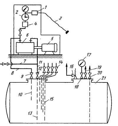 Рис. 20.6. Схема хранилища и газонаполнительной колонки для сжиженного газа: 1— электромагнитный вентиль; 2 — жидкостной счетчик; 3 — заправочный шланг; 4 — фильтр; 5 — электродвигатель; 6 — жидкостной насос; 7 — трубопровод от опоражниваемой цистерны; 8, 10 — трубопроводы слнвной линии; 9 — вентиль сливной линии; 11, 13 — трубопроводы всасывающей линии; 12 — вентиль всасывающей линии; 14 — указатели уровня жидкости; 15 — трубки указателей уровня; 16 — предохранительный клапан; 17 — манометр; 18 — вентиль манометра; 19 — вентиль указателя максимального уровня заполнения; 20 — вентиль промывочной трубы; 21 — подземная цистерна