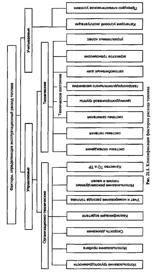 Эксплуатационный расход топлива, как правило, превышает контрольный расход топлива, приведенный в технической характеристике автомобиля. Обусловлено это тем, что в реальных условиях эксплуатации на расход топлива оказывают влияние ряд дополнительных факторов (рис. 20.2), которые можно разделить на управляемые и учитываемые.