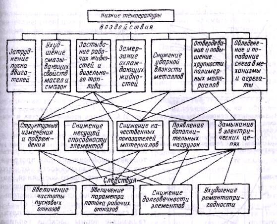 Рис 1. Схема воздействия низких температур на показатели надежности автомобилей