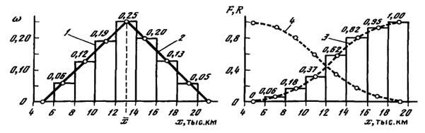 1 - гистограмма, 2 - полигон распределения, 3 - интегральная функция вероятности отказов и 4 - безотказной работы