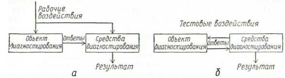 В зависимости от способа функционирования воздействия на объект различают системы функционального и тестового диагнозов. Обобщенные функциональные схемы этих систем показаны на рис. 4.3.
