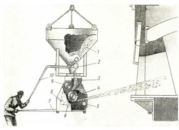 Пневматические заправочные машины - подают материал струей сжатого воздуха. Заправочный материал помещается в мульду, на дно которой укладывается два коллектора, соединенных патрубками с прорезями. Из торцевой части мульды к каждому коллектору подведена труба, в которую вставляют шомпол с подачей сжатого воздуха. Мульда заполняется магнезитовым порошком, навешивается на хобот загрузочной машины и вводится в печь. Воздух поступает из цеховой магистрали. Магнезитовый порошок просыпается в прорези направляющих патрубков, подхватывается потоками сжатого воздуха и подается на поврежденный участок футеровки.