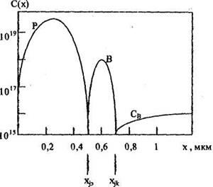 Рис. 1.1. Профили распределения фосфора в Si после двухстадийной диффузии.