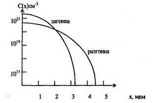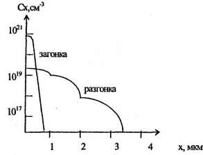 Если построить распределение концентрации Р, после загонки и разгонки получим следующие зависимости (рис. 1.2)