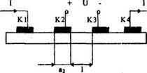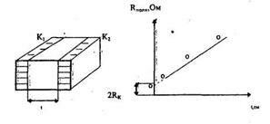 Сущность метода состоит в том, что при прохождении тока по полупроводниковому образцу с металлическими контактами напряжение падает как на сопротивлении объема полупроводника, так и на Rk. Если снять зависимость потенциала на поверхности образца от расстояния до границы НК, то экстраполяцией этого графика к точке на границе контакта можно определить падение напряжения на контакте: