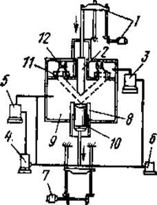 1– механизм подачи электрода; 2 – переплавляемый электрод; 3-6 –вакуумные насосы; 7 – механизм вытягивания слитка; 8 – водоохлаждаемый кристаллизатор; 9 – камера печи; 10 – слиток; 11-12 – электронные пушки и системы фокусирования пучка электронов