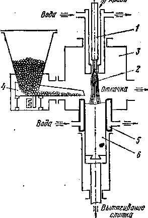 1– плазмотрон; 2 – плазменная дуга; 3 – плавильная камера; 4 – механизм подачи юо.пеной шихты; 5 – водоохлаждаемый кристаллизатор; 6 – слиток