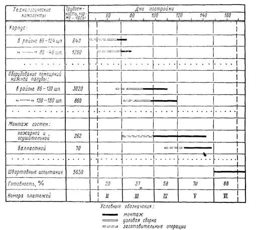 К генеральному графику обычно прилагаются: отдельный график контрагентских поставок, график выполнения работ на отдельных позициях и график необходимого числа рабочих по специальностям. Совокупность этих документов является основанием для планирования на заводе всей постройки данного судна или серии судов. В последнем случае на основании генеральных графиков по каждому типу судов составляют еще годовой график спуска и сдачи (стапельное расписание) судов, предусмотренных всей судостроительной программой завода. На этом графике указывают продолжительность отдельных периодов постройки каждого судна и некоторых контрольных моментов, например закладки, спуска, сдачи судов.