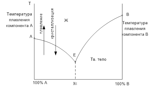 В точке Е раствор насыщен одновременно обоими компонентами. Ниже точки Е расположены две твердые фазы, насыщенные соответственно, с преобладанием компонента А и В. Над кривыми раствор находится в жидком состоянии, под кривыми – в твердом.