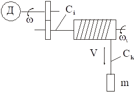 Заменим, например, систему подъемника, изображенную на рис., эквивалентной системой, содержащей только вращающиеся элементы.