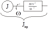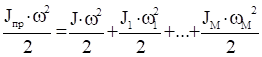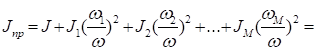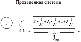 Если система эл.привода состоит из нескольких инерционных элементов (см. рис.), имеющих моменты инерции J1,J2,…Jn, вращающихся с угловыми скоростями w1,w2,...wn, и параметры системы таковы, что влиянием упругих связей можно пренебречь, их динамическое действие можно заменить действием одного момента инерции Jпр, приведенного к расчетной скорости (валу двигателя). Под ним понимают момент инерции простейшей системы, состоящей только из элементов, вращающихся со скоростью оси, к которой производится приведение, и которая обладает