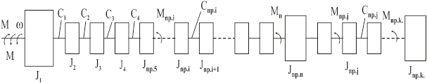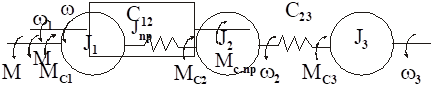 Здесь J1,J2,J3 – суммарные приведенные моменты инерции, образованные приведенными массами, связи между которыми приняты жесткими. С12 и С23 – приведенные жесткости упругих связей между J1 и J2, J2 и J3.
