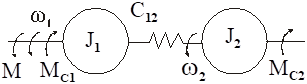 В двухмассовой расчетной схеме J1 – это суммарный приведенный момент инерции ротора (якоря) двигателя и других элементов, жестко связанных с двигателем, а J2 суммарный приведенный момент инерции элементов, жестко связанных с рабочим органом механизма. Упругая связь между J1 и J2 характеризуется эквивалентной жесткостью С12. Суммарные моменты сопротивления на валу двигателя и механизма – Мс1 и Мс2.
