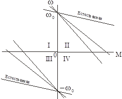 В соответствии с 2-мя направлениями вращения имеют место 2-семейства механических характеристик. Для положительного направления вращения одно семейство пересекается в точке w0, а для противоположного направления вращения – в точке -w0.Уравнение механической характеристики для обратного направления вращения имеет вид: