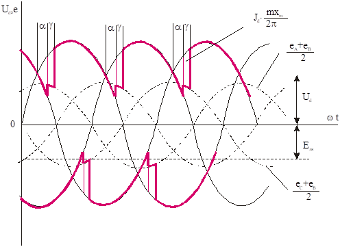 Кривые выпрямленного напряжения с учетом явления коммутации вентилей, характеризуемой углам g, изображены на рис