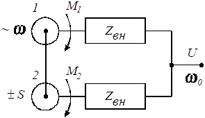 Приближенную оценку режима можно дать, приняв, что несинхронно работающая машина разделяется на две механически связанные – синхронную (1) и асинхронную (2).