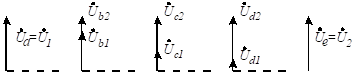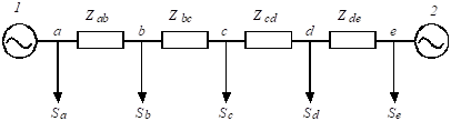 Напряжение в любой точке электрической системы может быть представлено векторной суммой двух частных напряжений, каждое из которых определяется только ЭДС одного источника и «электрическим удалением» этой точки от источника, т.е. напряжение точки «а» зависит практически только от ЭДС источника 1, точки «е» – от ЭДС источника 2, напряжения промежуточных точек – суммы частных напряжений. Точка «с», в которой частные напряжения равны, может быть названа «электрическим центром» системы.