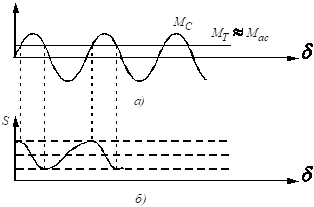 | Рисунок 9.4 – Изменения синхронного момента (а) и вызываемого им изменения скольжения (б) |