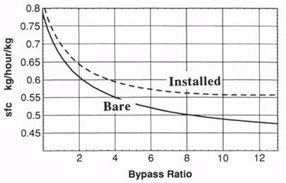 Сравнивание удельных расходов топлива для «голого» и «установленного» двигателей изображено на рисунке 7.4. При увеличении степени двухконтурности от 6 до 10 произойдёт сокращение удельного расхода топлива на 2.0 %. Выгоды от увеличенной степени двухконтурности на тягу нетто будут также незначительны. При создании двигателя с большей степенью двухконтурности повысятся масса двигателя и габариты мотогондолы, которая также станет более тяжелой; такие увеличения в весе повлекут уменьшение полезной нагрузки и сокращение дальности полёта.