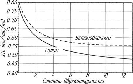 Расчетные изменения удельного расхода топлива от степени двухконтурности для чистого и установленного двигателя. Условия соответствуют рисунку 7.3.
