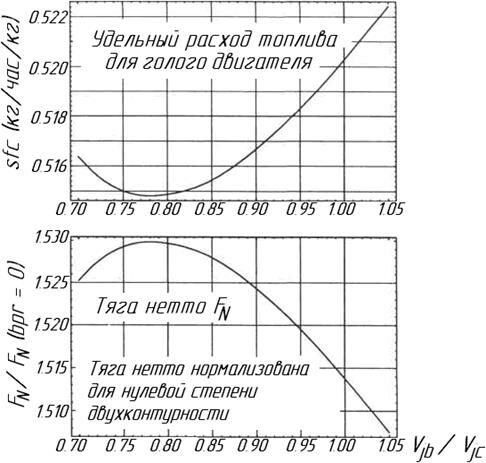 В упражнениях 7.1 и 7.2, также как и на рисунках 7.3 и 7.4, принималось, что скорость потока внешнего контура равна скорости потока реактивного сопла газогенератора. На рисунке 7.5 показаны числовые результаты для того же самого газогенератора, который рассматривался в упражнении 7.1 и на рисунках 7.3 и 7.4. Самый низкий удельный расход топлива и самая высокая тяга нетто получаются при условии, что Vjb / Vjc ≈ 0.78. От ранее полученного оптимума с более простым предположением о коэффициенте Vjb / Vjc = 1.00, отличие на величину менее 1%. При более серьёзном подходе к проектированию, несомненно, учитывается неравенство реактивных скоростей, но для простоты и с целью получения навыков нашим условиям чаще удовлетворяет более простое и удобное предположение.