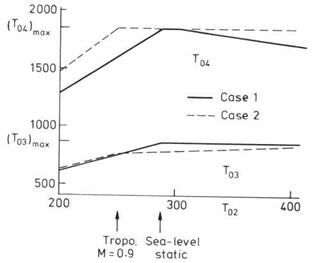 T04 / Т02 = 1850 / 288 = 6.42 (так же как и для Проекта 1), но для Проекта 2, полное отношение давлений будет уменьшено до 21.4. Ниже, это будет продемонстрировано количественно. На рисунке 17.1 эта величина температуры показана возле Проекта 1. Первоначальный предел Проекта 2 ограничен температурой на входе в турбину. Поскольку рассматривается запертый двигатель при температуре 251 K (совершающий полёт на высоте тропопаузы при числе Маха М = 0.9), отношение давлений компрессора и температурное повышение намного ниже, а температура за компрессором никогда не достигает своего верхнего предела.