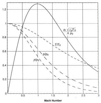 Для данного газа m - функция только Числа Маха, и это показано для воздуха (y = 1.40) на рис. 6.2. Обратите внимание, что в горле, когда М = 1,
