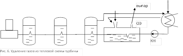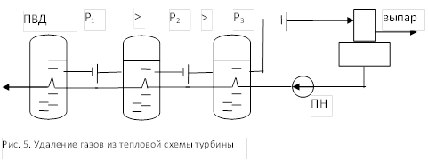 Остатки газов, не удалённые в деаэраторе с питательной водой попадают в котельный агрегат, а затем в турбину. С отборным паром поступают на ПВД и ПНД, где накапливаются со стороны греющей среды , т.е. со стороны пара. В конденсате газы не растворяются, т.к. идёт процесс конденсации и над поверхностью конденсата образуется пар. Накапливаясь, газы ухудшают процесс теплообмена и снижают эффективность регенерации. Из деаэратора газы удаляются с выпаром.