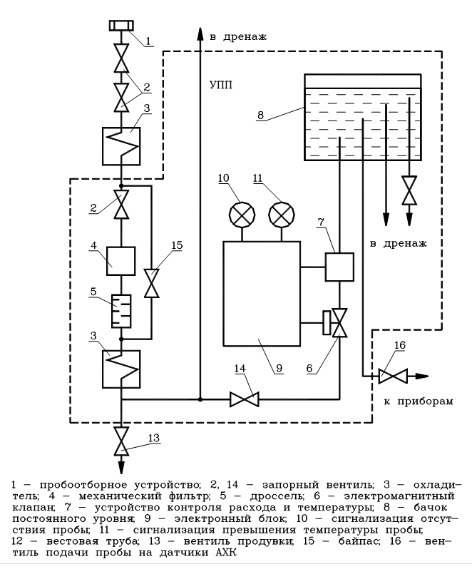 Анализируемая проба II контура отбирается пробоотборными устройствами (рис. 37), выполненными из нержавеющей стали и установленными непосредственно в технологическом трубопроводе, подается на стенд подготовки пробы и затем на датчики анализаторов.