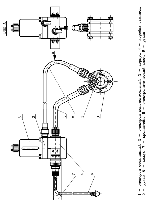 Для передачи сигнала от электродной системы к высокоомному преобразователю используется коробка зажимов с рукавом. Провод стеклянного электрода пропускается через сальниковый узел штуцера и подсоединяется к белому зажиму 3 коробки зажимов. К цветному зажиму 4 подсоединяется провод от потенциалообразующего элемента ЭХСВ-1 вспомогательного выносного электропровода или провод вспомогательного погружного электрода. Зажимы вместе с изолятором можно вынуть из коробки зажимов для осмотра или промывки при нарушении изоляции электродных цепей, отвернув винт 7.